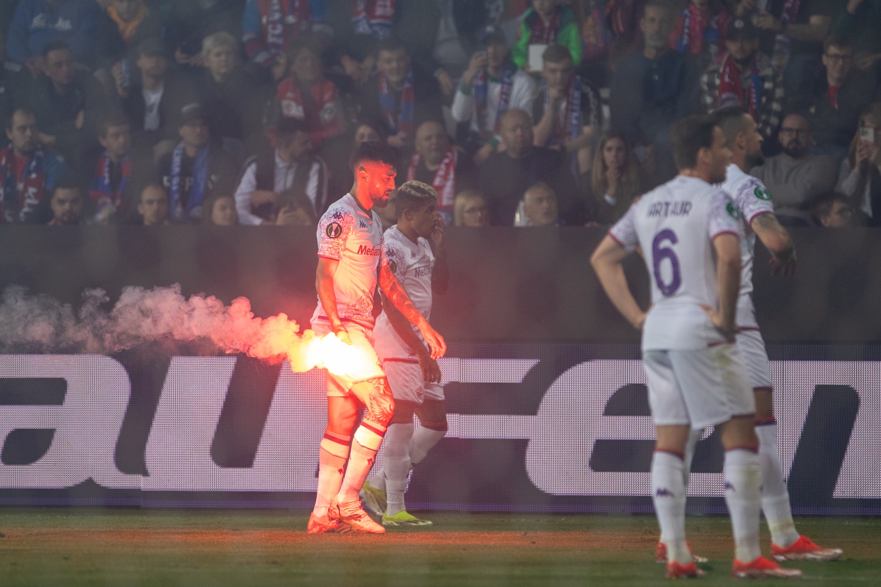Komu se ovšem utkání nepovedlo, byl sudí z Izraele, Matěj Vydra a fanoušci Fiorentiny. Ano, jejich podpora svých fotbalistů byla hlasitá, a slyšitelná po celý zápas. Klobouk dolů. Ale v počátku druhé půle, kdy se tým z Apeninského poloostrova nadechoval k náporu ze sektoru hostí, vlétlo na hřiště několik dýmovnic. Na pár minut přerušený zápas vzal fialkám vítr z plachet. S pyrem měl hostující sektor problém po celý zápas, a větu: „Si ricorda ai tifosi in trasferta che non è consentito lʼuso di materiale pirotecnico durante la partita. Grazie,“ jsem za zápas z reproduktorů stadionu slyšel tolikrát, že si ji budu jistě pamatovat do konce života. Pro neznalé italštiny česky: „Upozorňujeme fanoušky hostujícího týmu, že používání pyrotechniky při zápase není dovoleno. Děkujeme!“.