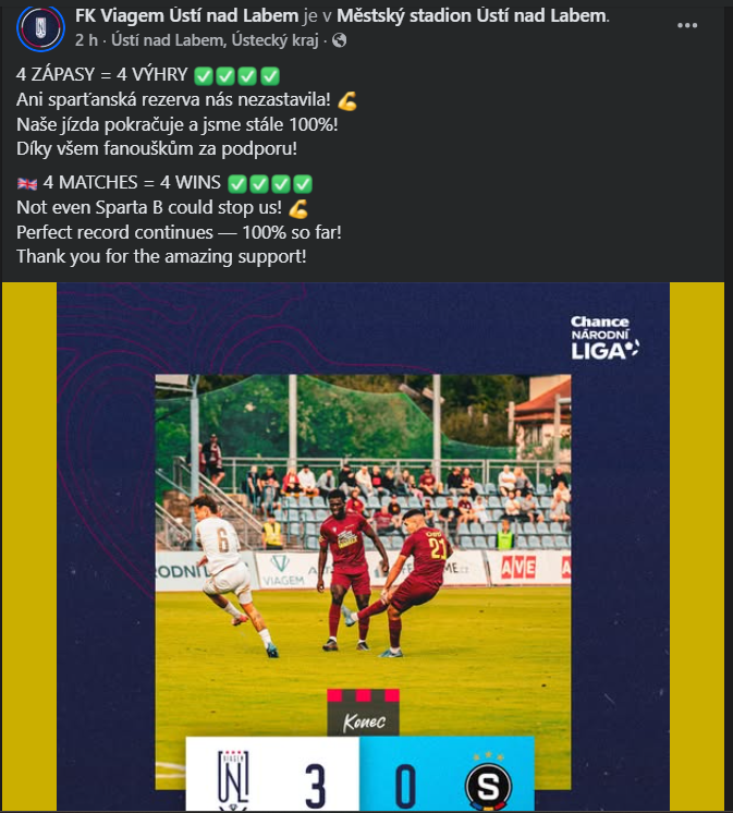 Fotbalisté Ústí pokračují ve velkém stylu nejen na hřišti, ale i marketingově. Nováček soutěže je nadále stoprocentní a nebýt gólu Hoffmana z 93. minuty v současně hraném zápase Zbrojovka – Táborsko, mohli dokonce už ligu vést. Takto se severočeští fotbalisté musí „spokojit“ s druhým místem o skóre za největším aspirantem na postup Zbrojovkou Brno.