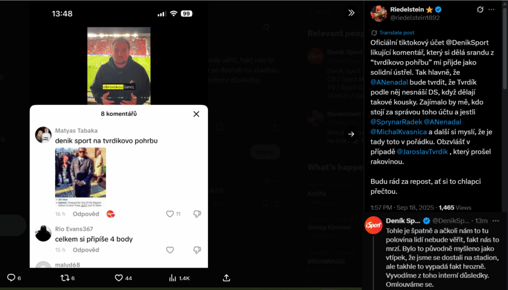 A pokračuje to někdy až za hranu. Třeba v případě, že deník Sport svým oficiálním účtem lajkoval příspěvek, který si dělá legraci z Tvrdíkovo pohřbu. Představitel Slavie přitom v minulosti prošel těžkou nemocí a podobné srandičky rozhodně nejsou na místě. Za mě ani u lidí, kteří tou nemocí neprošli. Deník Sport se sice za to omluvil, ale vzít zpátky už to nemůže. A podobná věc samozřejmě ještě vztahy mezi slávistickými fanoušky a deníkem zhorší a ještě více rozostří spekulace, že je deník pod sparťanským vlivem.