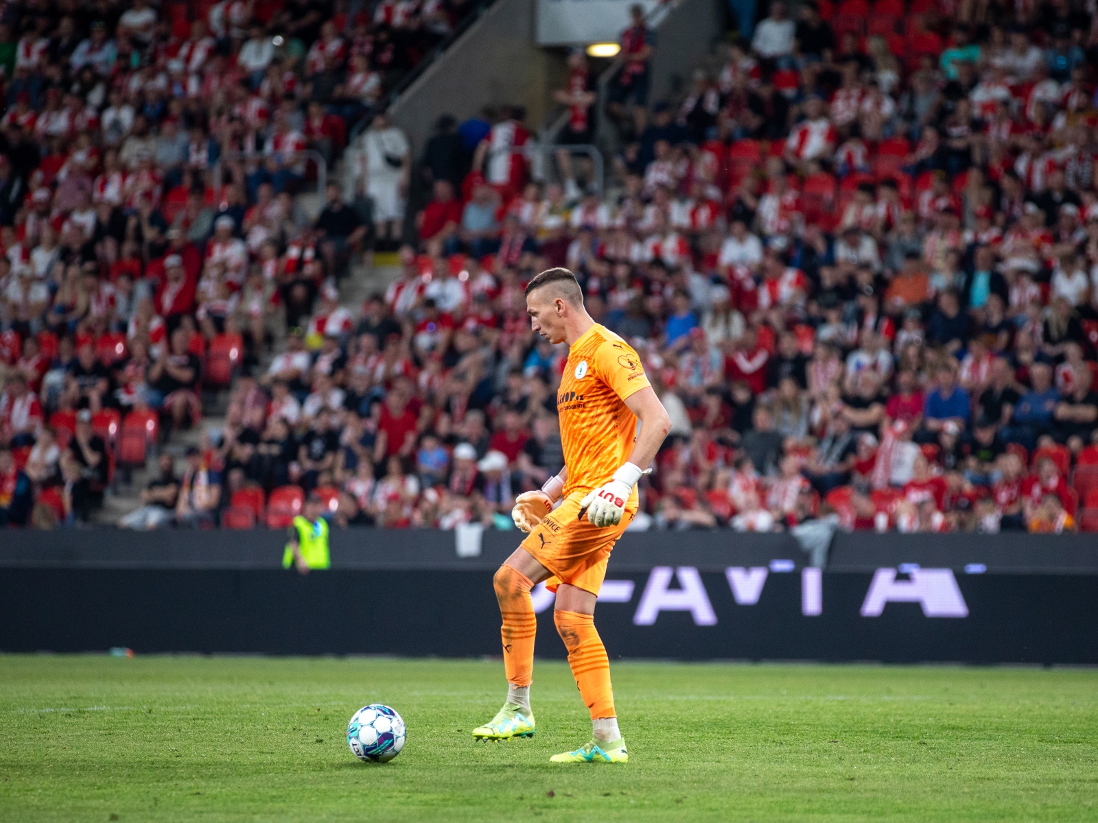 Do konce poločasu se na projevu na hřišti nic nezměnilo. Slavie s míčem na noze hrála, tlačila. O tom svědčí i poločasový údaj o poměru držení míče přes 70% pro sešívané. Přímé střely na branku však vyslala pouze dvě. Gólman Staněk zasahovat nemusel ani jednou.